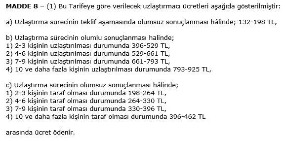 2019 YILI UZLAŞTIRMACI ASGARİ ÜCRET TARİFESİ Amaç MADDE 1 – (1) Bu Tarifenin amacı, 4/12/2004 tarihli ve 5271 sayılı Ceza Muhakemesi Kanunu gereğince soruşturma ve kovuşturma makamlarının talebi üzerine görevlendirilen uzlaştırmacılara ödenecek meblâğ ile ödenmesine ilişkin usul ve esasları belirlemektir. Kapsam MADDE 2 – (1) Bu Tarife Ceza Muhakemesi Kanunu hükümleri uyarınca uzlaştırmacılara ödenecek meblağı kapsar. Dayanak MADDE 3 – (1) Bu Tarife 5271 sayılı Ceza Muhakemesi Kanununun 253 üncü maddesi ile 10/7/2018 tarihli ve 30474 sayılı Resmî Gazete’de yayımlanan 1 sayılı Cumhurbaşkanlığı Teşkilatı Hakkında Cumhurbaşkanlığı Kararnamesinin 41 inci maddesi hükümlerine göre hazırlanmıştır. Uzlaştırma ücretinin sınırları MADDE 4 – (1) Uzlaştırma ücreti, uzlaştırmacının şüpheli veya sanık ile mağdur veya suçtan zarar görenin yaşı, eğitimi, sosyal ve ekonomik durumu gibi belirgin farklılıklarını değerlendirmede ve tarafları uzlaştırmadaki becerisi, süreçte gösterdiği gayret, taraf sayısı, uyuşmazlığın kapsam ve niteliği dikkate alınarak bu Tarifede gösterilen alt ve üst sınırlar arasında belirlenir. (2) Birden fazla uzlaştırmacının görevlendirildiği hâllerde uzlaştırma ücreti bu kişilere ayrı ayrı ve eşit olarak ödenir. Uzlaştırma ücretinin ödenmesi MADDE 5 – (1) Görevlendirilen uzlaştırmacı için belirlenen ücret, uzlaşmanın teklif aşamasında olumsuz sonuçlanması hâlinde teklif formu ve eklerinin tesliminden, teklifin kabulü hâlinde ise uzlaştırma süreci sonunda düzenlenecek raporun ibrazından sonra makûl süre içinde uzlaştırmadan sorumlu Cumhuriyet savcısı tarafından sarf kararı ile ödenir. Uzlaştırmacı giderleri MADDE 6 – (1) 10/2/1954 tarihli ve 6245 sayılı Harcırah Kanunu hükümleri uyarınca mutat olan taşıta göre yapılan zorunlu yol giderleri dâhil olmak üzere masraflar, bu Tarifenin 8 inci maddesinin birinci fıkrasının (b) bendinin (1) numaralı alt bendinde belirlenen miktarın alt sınırını geçmeyecek şekilde uzlaştırmacıya ayrıca ödenir. Uygulanacak tarife MADDE 7 – (1) Uzlaştırma ücretinin takdirinde uzlaştırma raporunun tamamlandığı tarihte yürürlükte olan Tarife esas alınır. Tarife MADDE 8 – (1) Bu Tarifeye göre verilecek uzlaştırmacı ücretleri aşağıda gösterilmiştir: a) Uzlaştırma sürecinin teklif aşamasında olumsuz sonuçlanması hâlinde; 132-198 TL, b) Uzlaştırma sürecinin olumlu sonuçlanması halinde; 1) 2-3 kişinin uzlaştırılması durumunda 396-529 TL, 2) 4-6 kişinin uzlaştırılması durumunda 529-661 TL, 3) 7-9 kişinin uzlaştırılması durumunda 661-793 TL, 4) 10 ve daha fazla kişinin uzlaştırılması durumunda 793-925 TL, c) Uzlaştırma sürecinin olumsuz sonuçlanması hâlinde; 1) 2-3 kişinin taraf olması durumunda 198-264 TL, 2) 4-6 kişinin taraf olması durumunda 264-330 TL, 3) 7-9 kişinin taraf olması durumunda 330-396 TL, 4) 10 ve daha fazla kişinin taraf olması durumunda 396-462 TL arasında ücret ödenir. Yürürlük MADDE 9 – (1) Bu Tarife yayımı tarihinde yürürlüğe girer. |