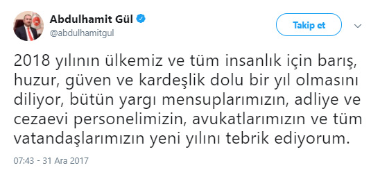 Twitter hesabından paylaşımda bulunan Bakan Gül mesajında, “2018 yılının ülkemiz ve tüm insanlık için barış, huzur, güven ve kardeşlik dolu bir yıl olmasını diliyor, bütün yargı mensuplarımızın, adliye ve cezaevi personelimizin, avukatlarımızın ve tüm vatandaşlarımızın yeni yılını tebrik ediyorum.” ifadelerini kullandı.