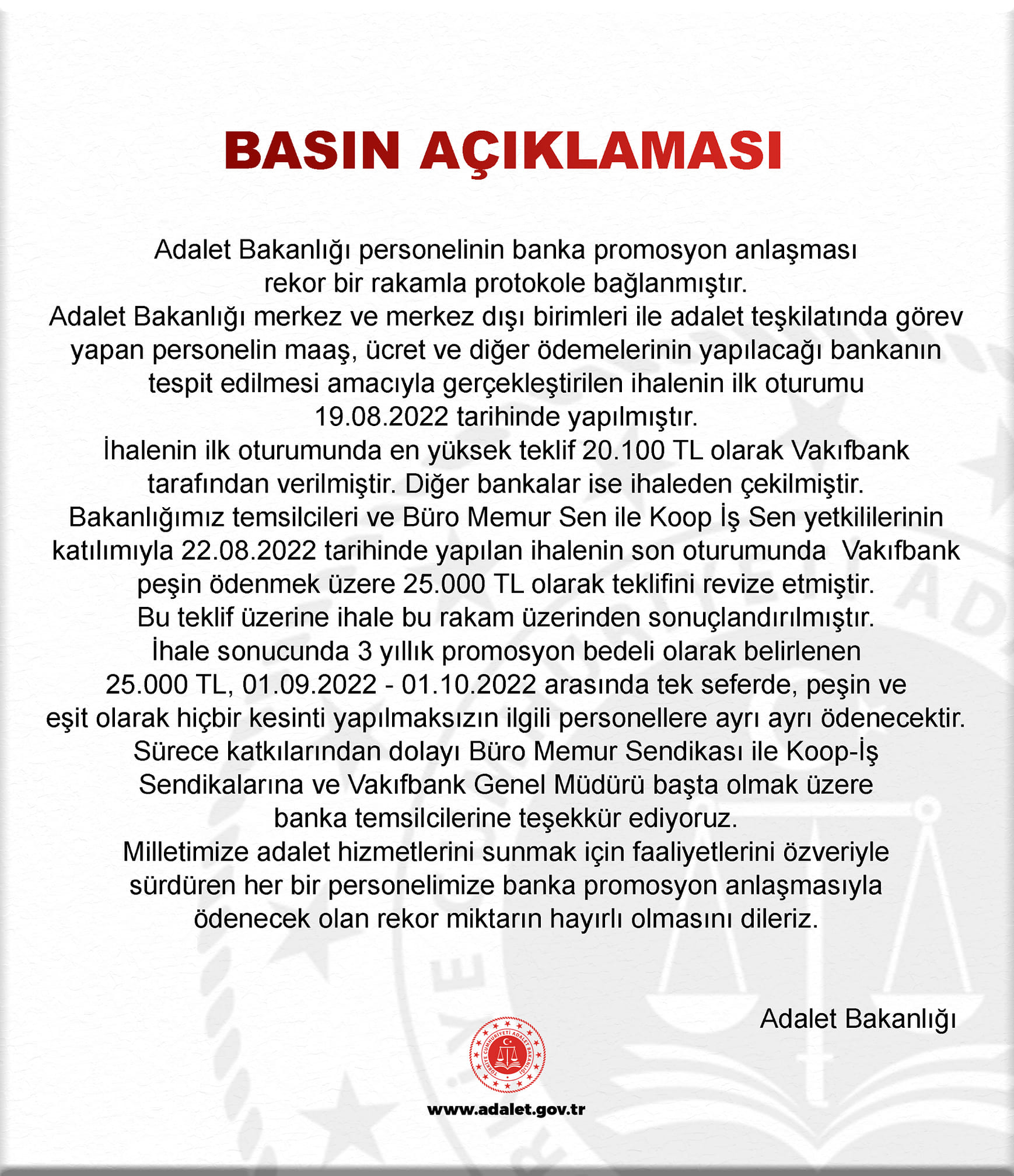 Adalet Bakanlığından yapılan basın açıklamasında, Adalet Bakanlığı personeline 3 yıllık promosyon bedeli olarak 25.000 TL ödeneceği ve ödemenin ise 01.09.2022 – 01.10.2022 arasında tek seferde, peşin ve eşit olarak hiçbir kesinti yapılmaksızın ilgili personellere ayrı ayrı ödeneceği ifade edildi.