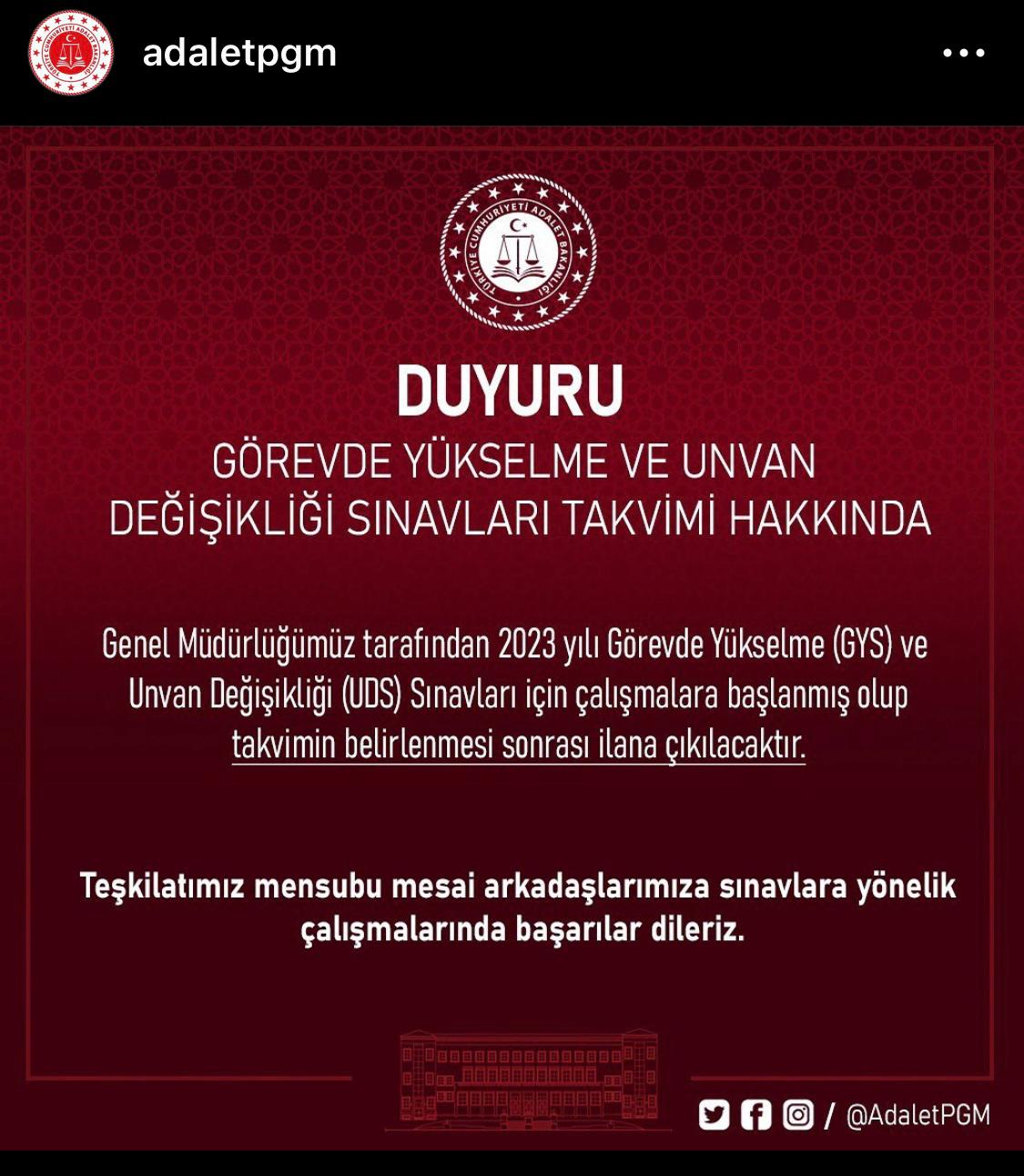 Adalet Bakanlığı Personel Genel Müdürlüğüne ait @adaletpgm Instagram hesabından yapılan paylaşımda; “Genel Müdürlüğümüz tarafından 2023 yılı Görevde Yükselme (GYS) ve Unvan Değişikliği (UDS) Sınavları için çalışmalara başlanmış olup takvimin belirlenmesi sonrası ilana çıkılacaktır. Teşkilatımız mensubu mesai arkadaşlarımıza sınavlara yönelik çalışmalarında başarılar dileriz.” açıklamasında bulunuldu.