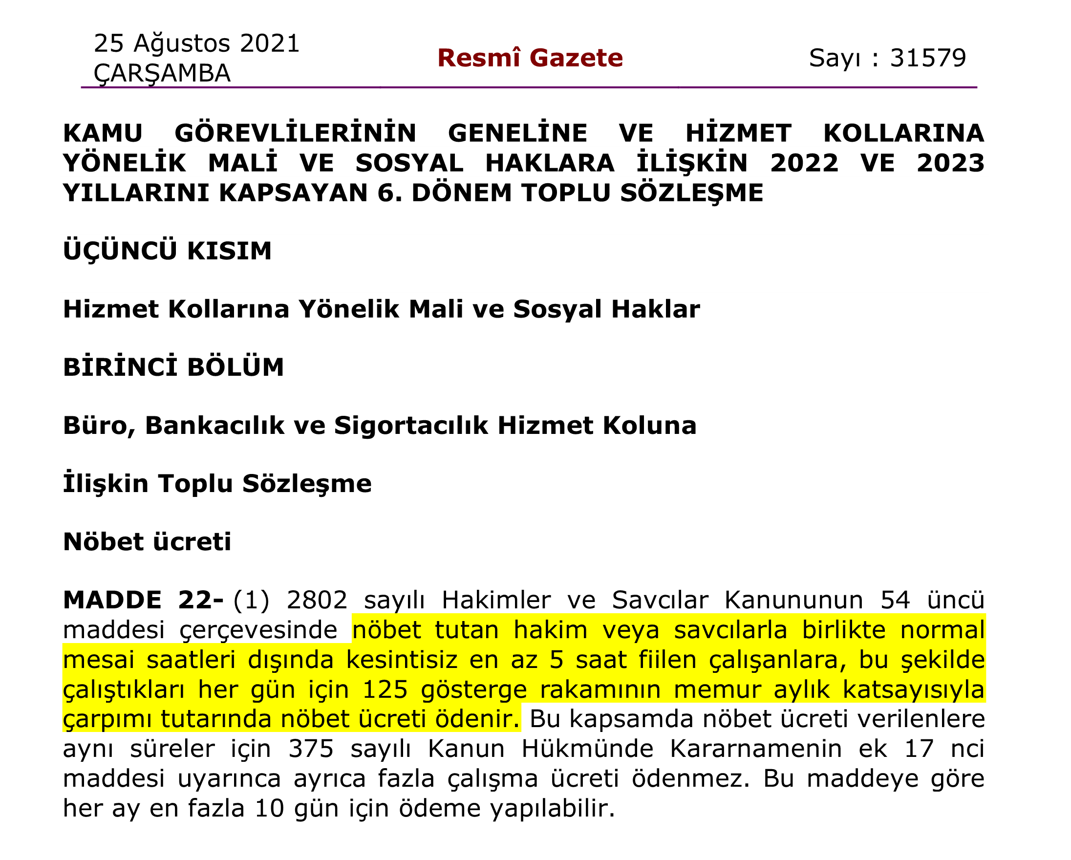 25.08.2021 tarihli ve 31579 sayılı Resmi Gazete’de yayımlanan Kamu Görevlilerinin Geneline Ve Hizmet Kollarına Yönelik Mali Ve Sosyal Haklara İlişkin 2022 Ve 2023 Yıllarını Kapsayan 6. Dönem Toplu Sözleşme’de Üçüncü Kısım’da yer alan 22. madde uyarınca nöbet tutan adliye personeline “Nöbet Ücreti” ödemesi yapılacak.