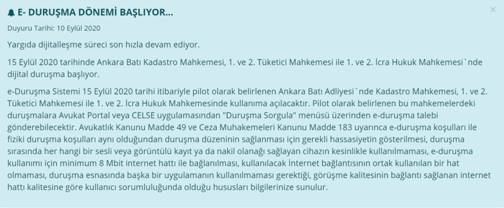 Adalet Bakanlığınca UYAP Portallarından yapılan duyuruda; Avukatların internet vasıtasıyla mahkemelere bulundukları yerden katılabilmelerinin yolunu açan e-Duruşma Sistemi’nin pilot olarak 15 Eylül’de uygulamaya başlayacağı öğrenildi.