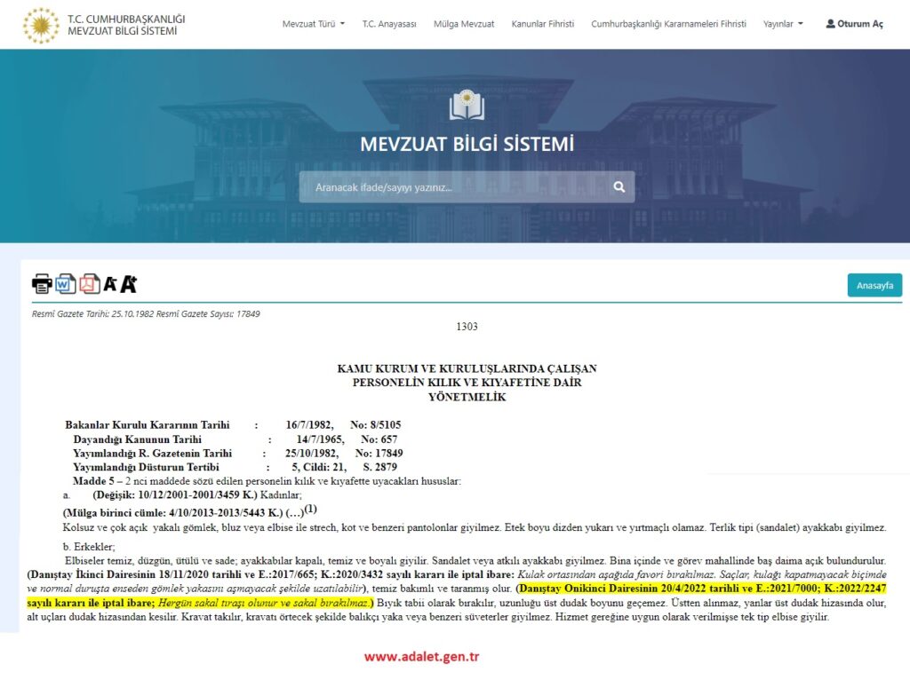 Kamuda erkek memurlara sakal bırakma serbestliğine ilişkin Danıştay 12. Dairesinin 20.04.2022 tarihli ve 2021/7000 esas, 2022/2247 karar nolu kararı Cumhurbaşkanlığı Hukuk ve Mevzuat Genel Müdürlüğünce hazırlanan Mevzuat Bilgi Sistemi’ne işlendi.