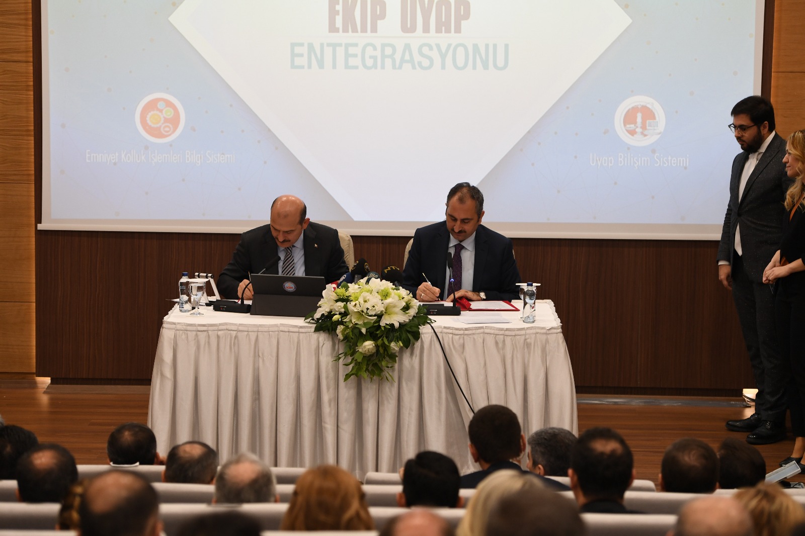 Adalet Bakanı Abdulhamit Gül ile İçişleri Bakanı Süleyman Soylu, yargı ile emniyet arasında yapılan yazışma ve işlemlerin elektronik ortamda gerçekleştirilmesini amaçlayan Ulusal Yargı Ağı Bilişim Sistemi’nin (UYAP), Emniyet Kolluk İşlemleri Bilgi Sistemi (EKİP) ile entegrasyonunu düzenleyen protokolü imzaladı.